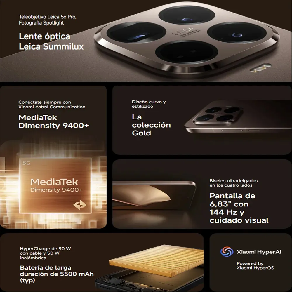 La autonomía no es un problema con su batería de 5500 mAh, que se complementa con carga rápida HyperCharge de 90W por cable y 50W inalámbrica, permitiendo que recuperes energía en minutos. Con conectividad 5G y Wi-Fi 7, el Xiaomi 15T Pro está listo para el futuro de la comunicación y el entretenimiento. Viene de fábrica con Android 15 y Xiaomi HyperOS 2.0, actualizable a Android 16 con HyperOS 3.0.